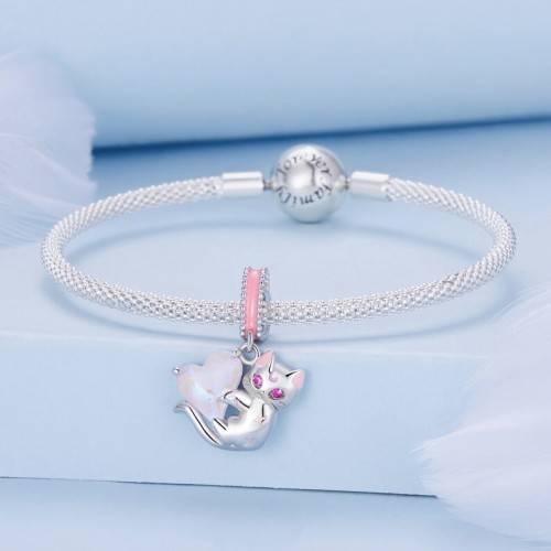 Aggiungi un tocco di magia e dolcezza al tuo bracciale o alla tua collana con questo incantevole charm pendente in argento 925, raffigurante un grazioso gattino abbracciato a un cuoricino rosa scintillante. Lo zircone rosa a forma di cuore, unito ai vivaci colori smaltati, cattura la luce e rende il pendente scintillante. Questo charm è compatibile con i bracciali delle marche più famose.