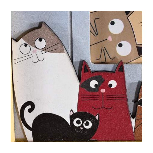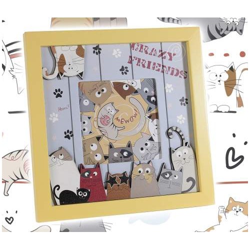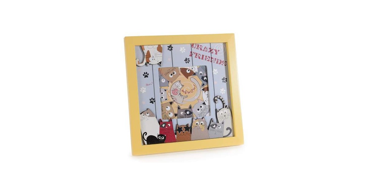 Una cornice portafoto da appoggio che è anche un piccolo oggetto di design. La cornice ha i bordi di un bel giallo luminoso, e la caratteristica che rende questa cornice unica è la presenza di illustrazioni di gatti in 3D. Ogni gatto sembra prendere vita, emergendo dallo sfondo della cornice con un effetto tridimensionale sorprendente.  La cornice è progettata per essere posizionata su qualsiasi superficie piana, come una mensola, un tavolo o una scrivania.